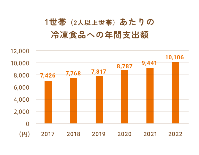 冷凍食品の技術向上により、冷凍食品=「おいしい」が定着。単身世帯や夫婦共働き世帯が増加し、常備食としても活用できる冷凍弁当のニーズが高まっています。